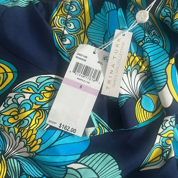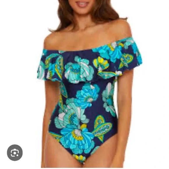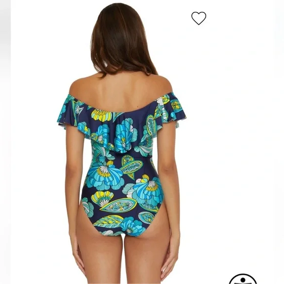 One piece swimsuit features an off the shoulder ruffle neckline. Offers a shelf bra with removable soft cups and moderate bottom coverage.Style: 3451145Ruffle detailOff-the-shoulder necklineBuilt-in shelf bra with paddingStraplessModerate bottom coverage with classic leg heightLinedPrint placement variesImported